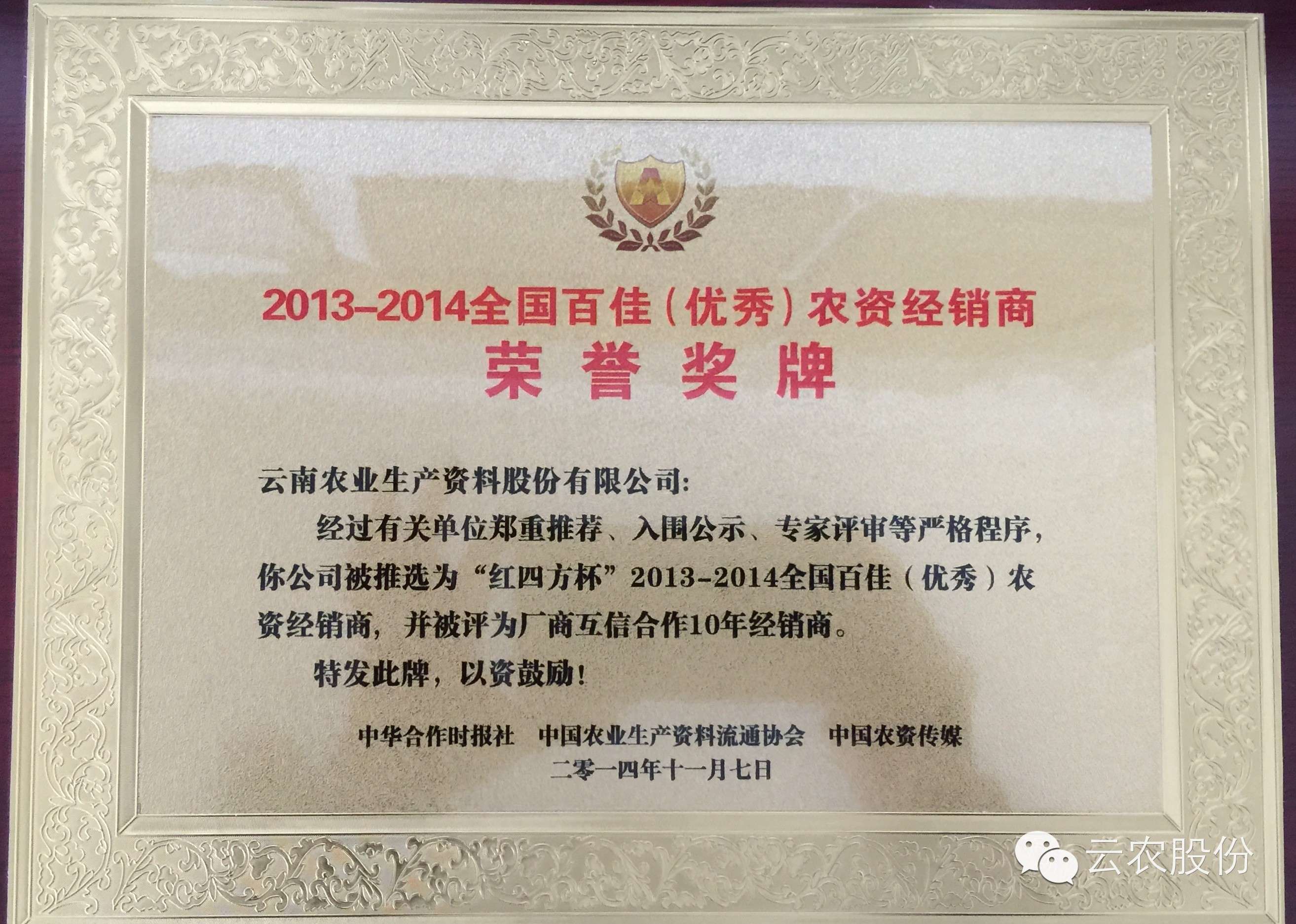 近日,由中国农业生产资料流通协会、中华合作时报社、中国农资传媒联合召开的“中国农资经销商年会暨全国百佳(优秀)农资经销商颁奖典礼”在宁波举行,云南农业生产资料股份有限公司被评为“2013-2014全国百佳(优秀)农资经销商,这已经是云农股份第四次荣获此殊荣了。
